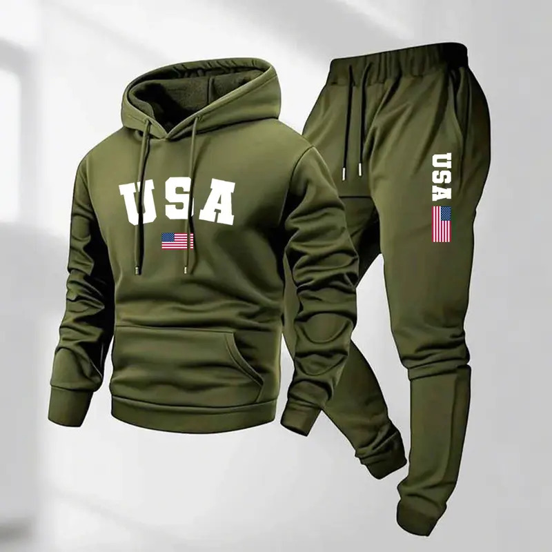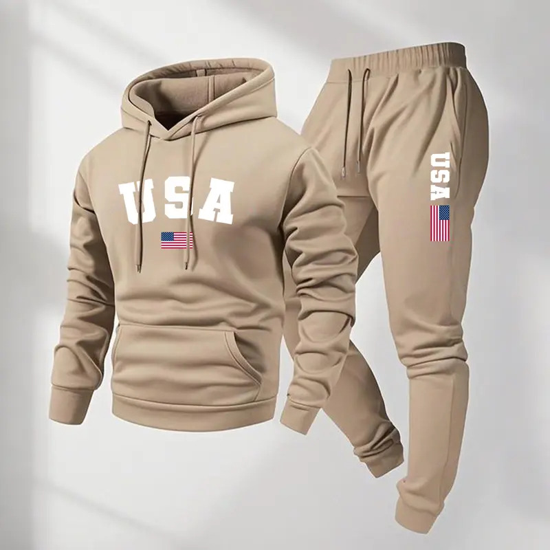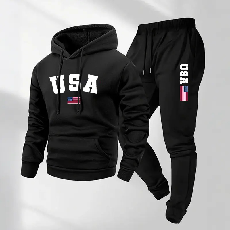 Men's USA Letter Printed Hoodie and Drawstring Sweatpants Set